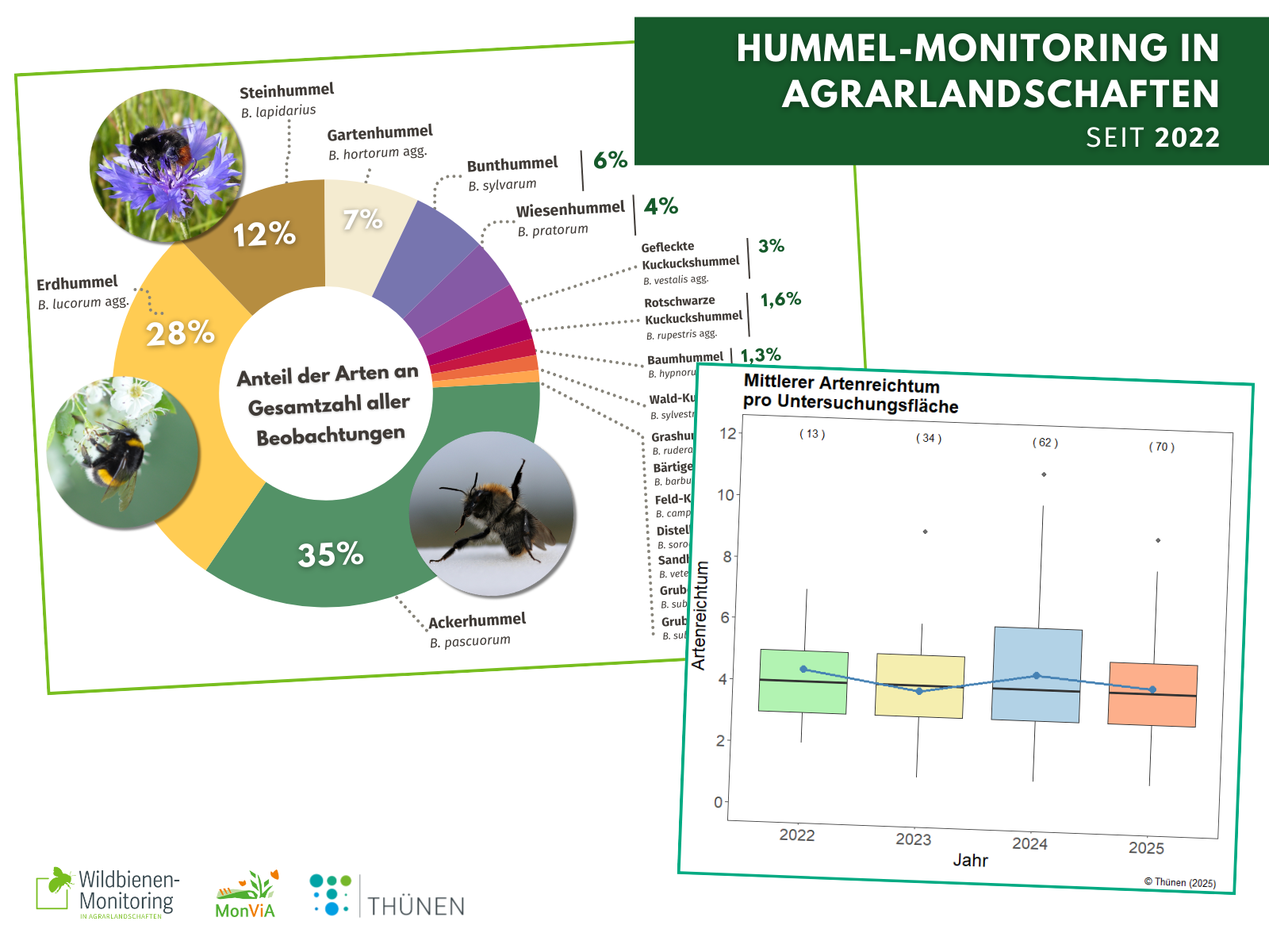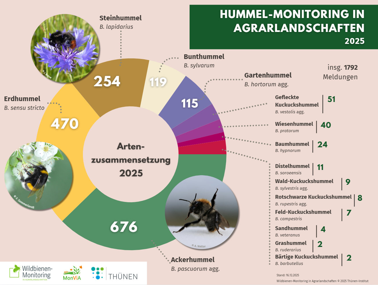 2025 sind für uns 78 Ehrenamtliche bundesweit in Agrarlandschaften mit ihren Hummel-Fanggenehmigungen unterwegs gewesen. Bei 460 Begehungen auf 76 Untersuchungsflächen haben sie dabei 1792 Hummeln aus 15 Hummelartengruppen erfasst.